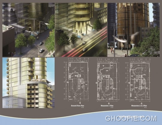 A very tight building site necessitated a special design for the bottom of the Point Tower in Toronto, Ontario. The location is 40 Wellesley East, Toronto, Ontario, Canada Contrary to Toronto's Hi-Rise Building Design Guidelines no "Podium" was used. The proposed 46-story tower was lifted up on freestanding columns with the elevator shaft visib...