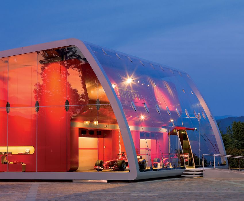 Full Glass Ferrari Factory Store Design. Glass factory architecture plan. Ferrari factory plan photo.