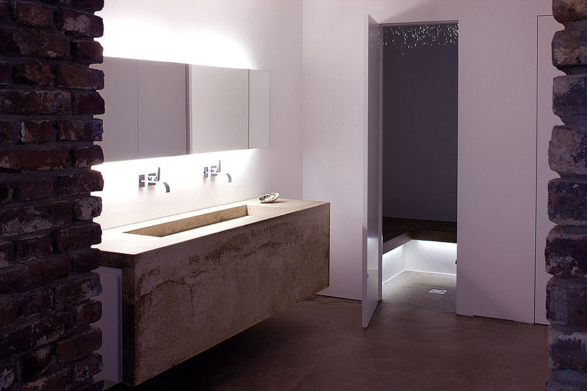 Architect Bruno Erpicum of agency AABE Erpicum & Partners leads us to look at an old loft in the city of Düsseldorf, Germany. The rugged brutality of the building is emphasized many times with carefully chosen interior design elements. Using exposed brick walls and pairing rustic and modern furniture fits equally well. Modern concrete basin design with large mirror by AABE Erpicum & Partners. Read full article »