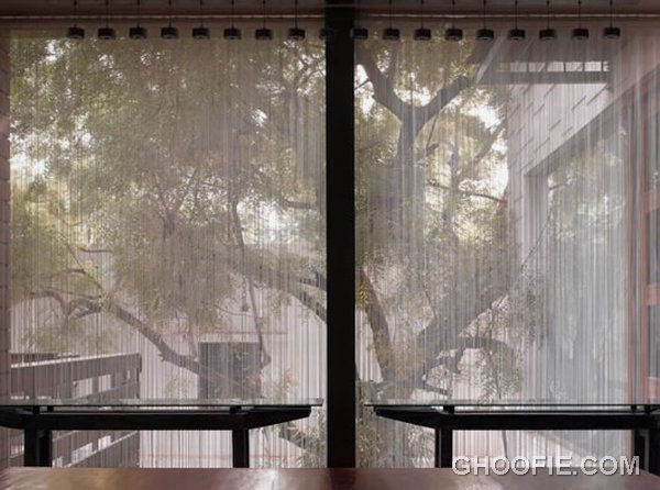 Contemporary blind for spacious residence design ideas. This glass window using a transparent curtain so that light can enter without blinding. There are also two interesting ethnic bench.