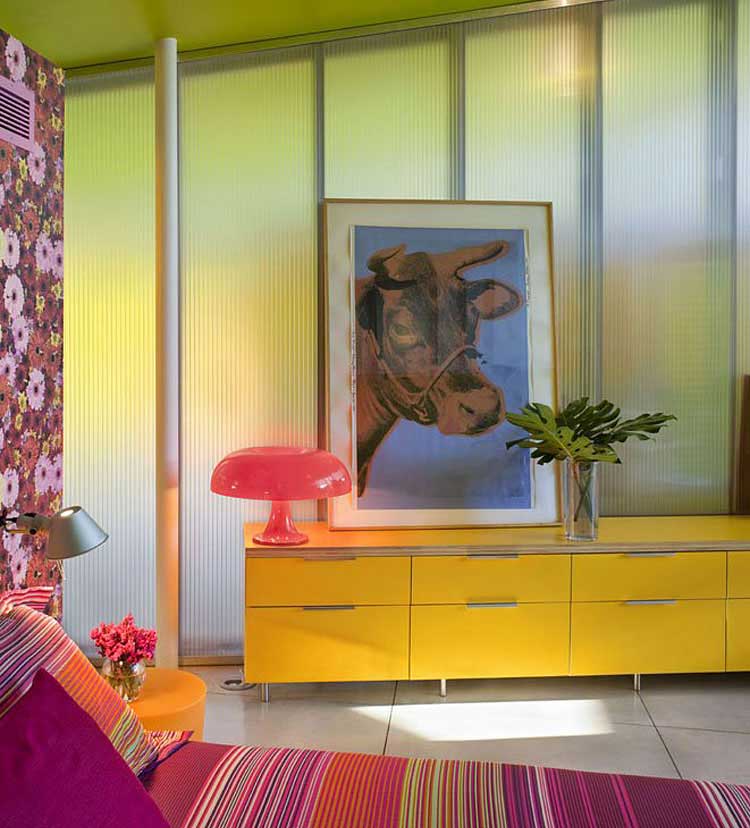 Stamberg Aferiat Architecture designed the Maison Plastique. This colorful retreat spanning 1100 square feet is their own headquarters. This building is located on Shelter Island at the eastern end of Long Island, NYC. Although construction of the place is making it look slightly cramped, it consists of two independent pavilions beside the swimming pools. One contains the master suite, and another living room as well as kitchen. Photos by: WarcholPaul; Via Architizer Pink Bed Room and Yellow Rack with Decorative Art Cow Head Read full article »