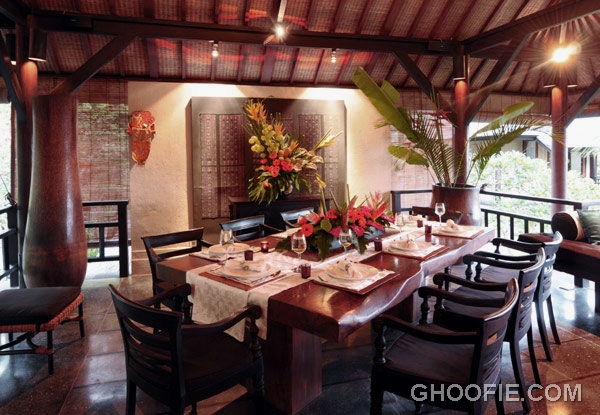 Exotic second floor dining room villa design ideas. Dining room is using a wooden table and chairs are elegant. Some works of art to be a marvelous decoration.