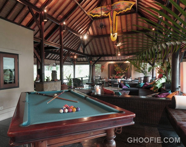 Second floor living room villa design ideas with pool table. You can enjoy your leisure time here. The scenery is beautiful and breezy air that is very tempting. On the second floor is open on purpose to make it more integrated with nature.