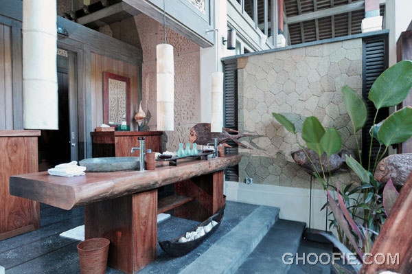Wet room villa design with two stone sink and marble floor. Wet room decor is very ethnic. Many wooden walls with beautiful carvings. Modern chandelier completes this wet room decor.