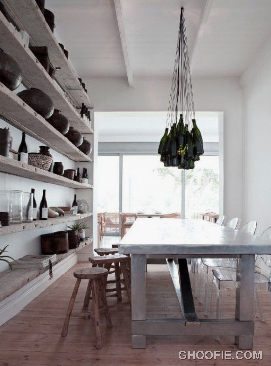 Dining room design ideas with concrete wine rack. Incomplete when the dining room there is no wine storage. In the design of the dining room there are two wine storage rack shaped concrete and hanging above the dining table.