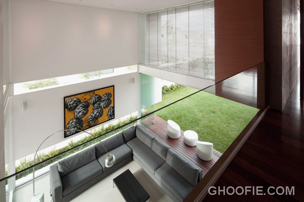 Contemporary living room with high ceiling design ideas. This is a living room appearance when viewed from the second floor. Glass is used as a separator. High ceiling makes the room more breezy atmosphere.