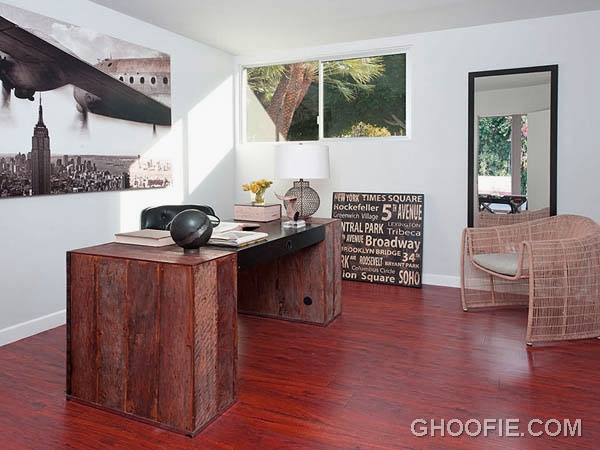 Elegant home office design with classy desk and rattan chair. The interior design of the home office is unique because there are several antique home decor complements this office.