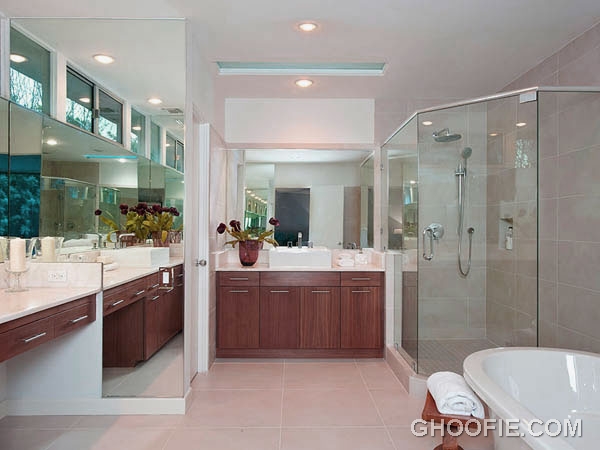 Luxurious bathroom design with wooden storage and glass shower box. This bathroom has a large mirror so much easier for you to style. Floor with tile in beige.