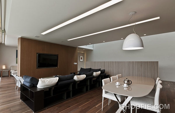 Cool living area design ideas with wooden divider. In the living area there is a sofa and a dining table. In the divider embedded a modern LCD. Living area looks very comfortable.