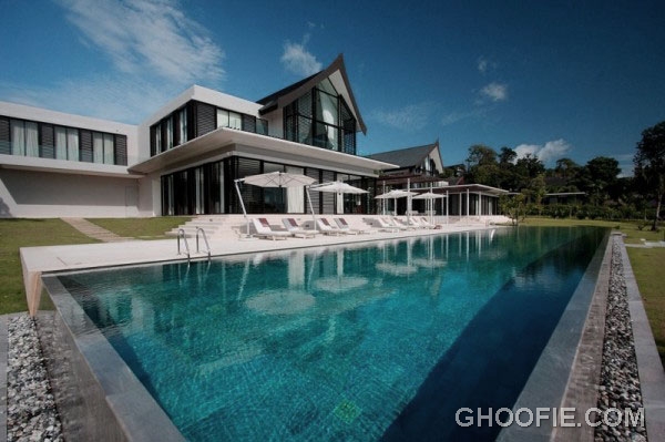 Appealing luxurious Phuket home design with stunning pool ideas. This is a luxurious modern home design. The front page there is a large enough pool. There are also several sundeck around the pool.