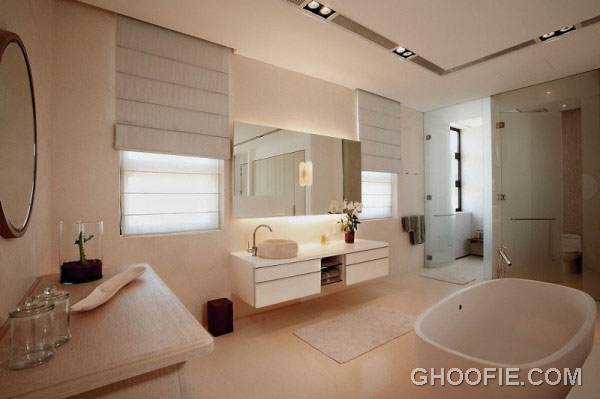 Luxurious master bathroom design ideas with modern furniture. The style of this bathroom looks very calm. There is a fancy bath and shower glass box. The curtains on the shower is controlled using the remote.