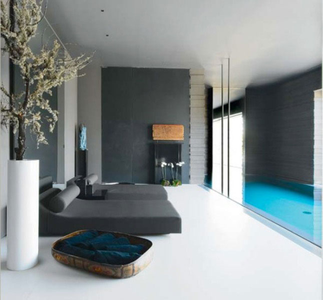 Modern Lounge with Grey Sofas and Indoor Pool Ideas – Minimalist House by Spanish architect Joaquin Torres from design studio A-cero.
