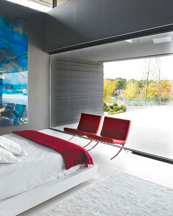 This ultra-modern and futuristic house is the work of Spanish architect Joaquin Torres from studio A-cero. This villa is located in suburban Madrid, Spain. This is a very modern house, created with sophisticated finishes as well as chic furnishings. Modern White Bedroom with red Elements - Minimalist House by Spanish architect Joaquin Torres from design studio A-cero. Read full article »