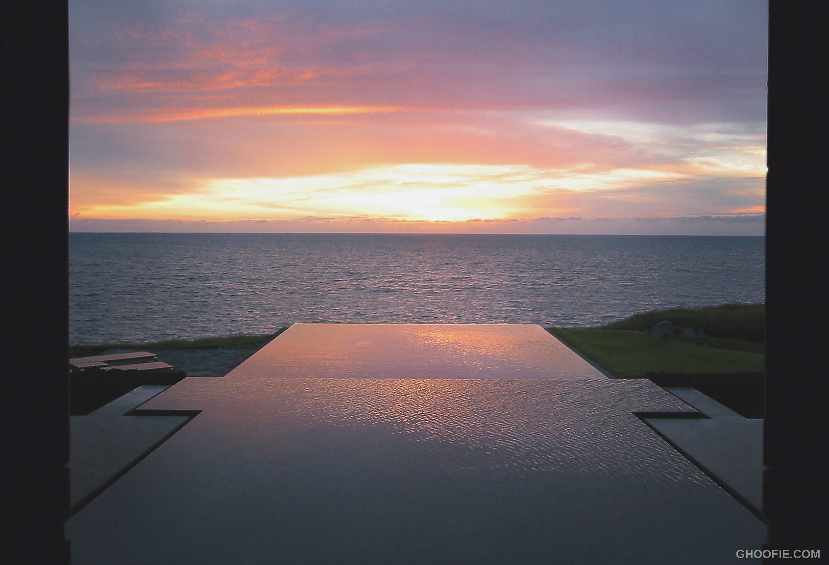 In the evening, the sophistication of this residence is quite highlighted in beautiful sunset. Pool terrace with sea views and beautiful sunset – by Olson Kundig architects.