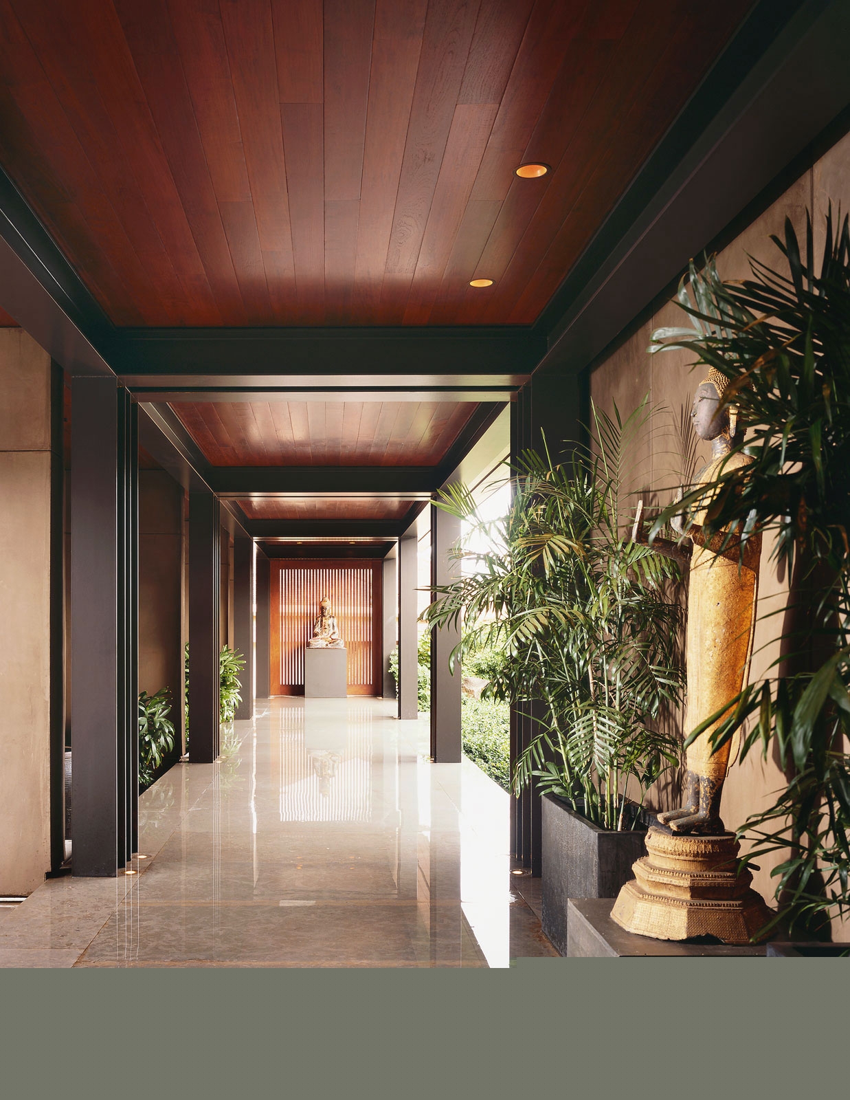 The area in this hallway has a great ambience with the garden in front it and the wood ceiling and floor marble. Tropical house with marble floor and wooden ceiling – by Olson Kundig Architects.