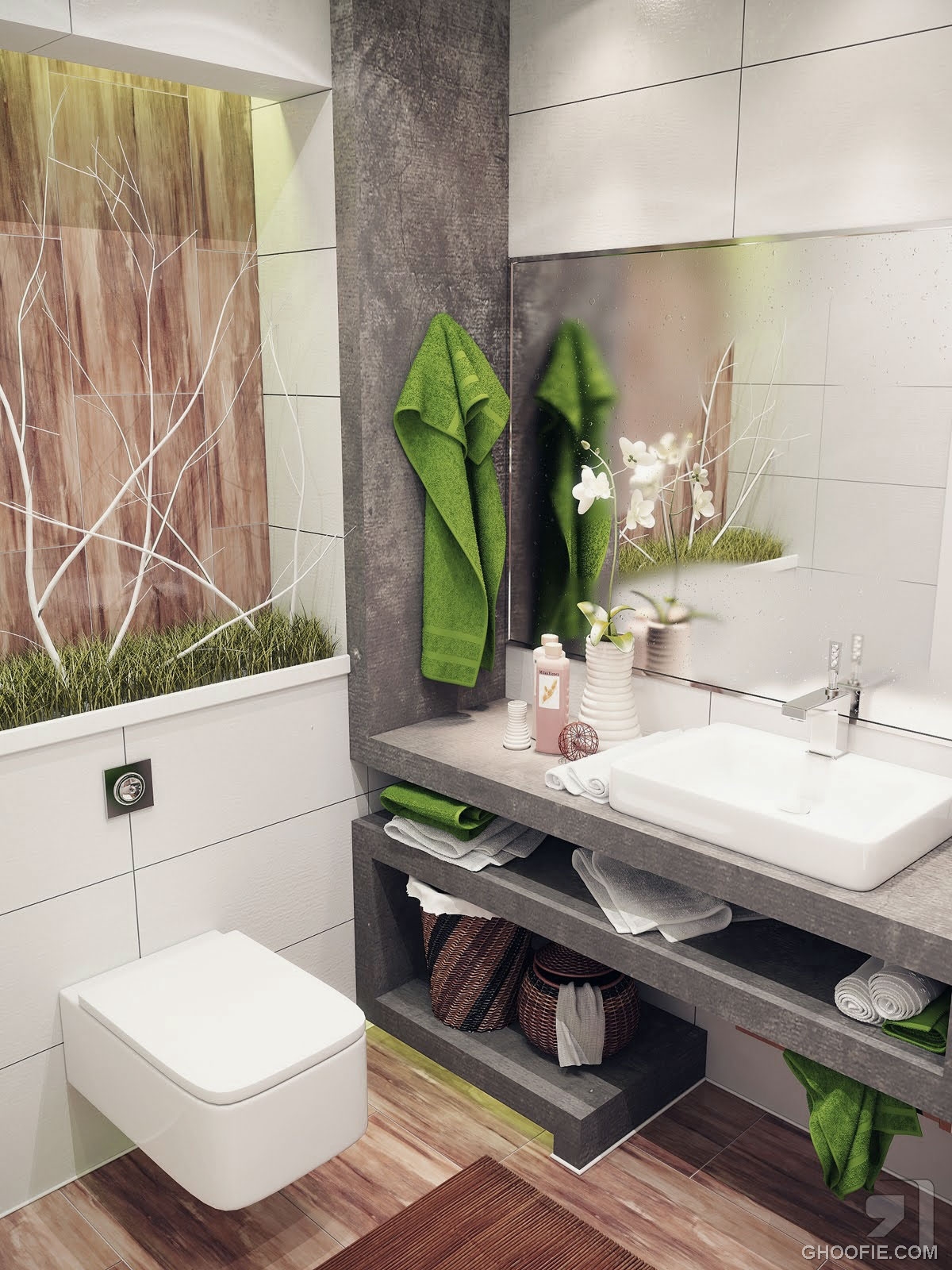 Small green white nature small bathroom design. Gray and white color makes it look a bit classical yet it still appears modern with its use of straight lines on this small bathroom.