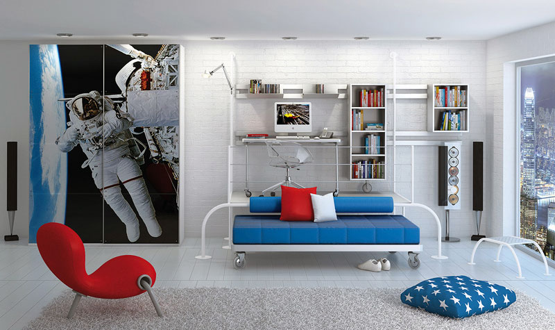 Astronaut Sticker Decor for Kids Furniture. Blue and white bedroom for kids design.