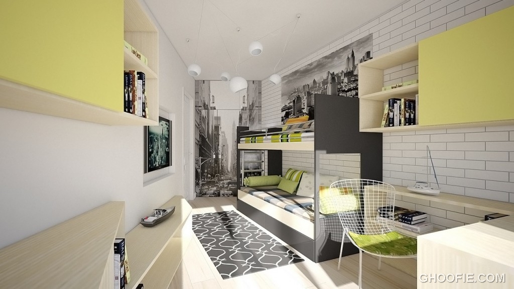 Gray green teen bedroom design rendering. Feel the elegant of your room with a gray bunk beds giving a stronger impact to the entire look.