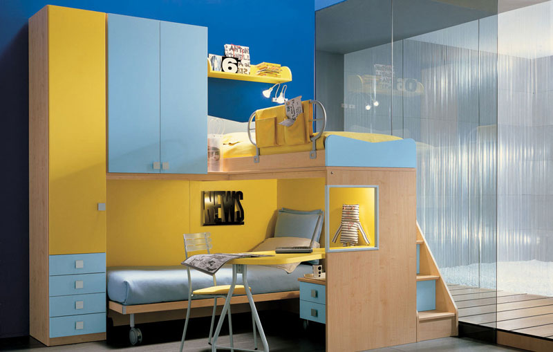 Pink and Blue Bunkbed with Glass Wall Decor. Yellow and blue bedroom designs. Modern bedroom yellow wall image 2011.