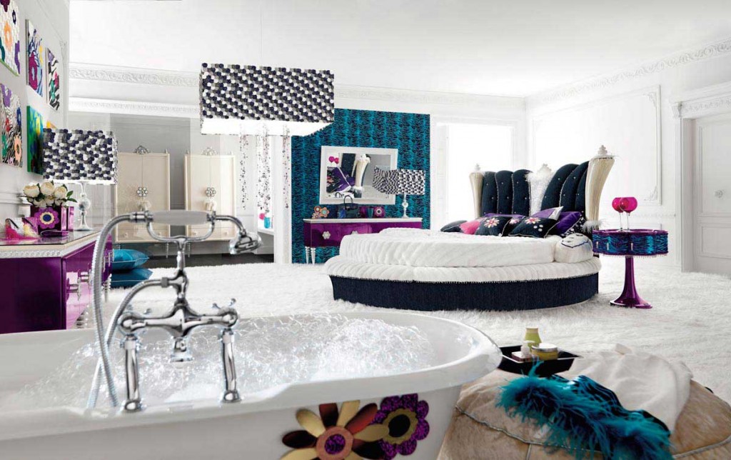 Glamourous bedroom designs from Altamoda company is very suitable for fans of luxury and glamour furniture. They offer furniture with striking colors and simple shapes. Purple-colored bed with luxurious trinkets is decorated with Swarovsky crystals. In the bedroom, white sink and modern bathtub are all in one open space. Truly, if we had to describe this bedroom in one word, glamorous is definitely it. Take a look in our gallery below. Luxury Bed and Bathtub in One Space with White Rugs Design... Read full article »