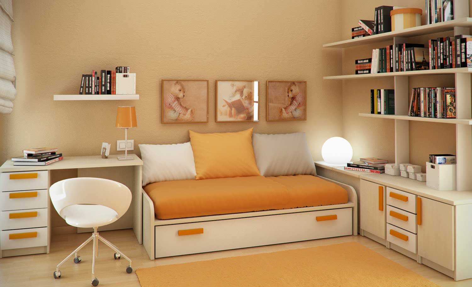 Beautiful Children Room Wdeas with Orange Rug and White Bookcase