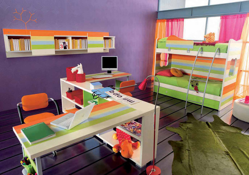 Bright and Dominant Color Purple Bedroom with Twin Study Desk