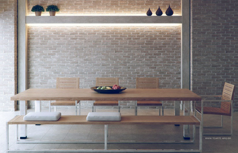 Original exposed brick dining room with recessed wall lighting. Neutral dining room atmosphere with bench table ideas.