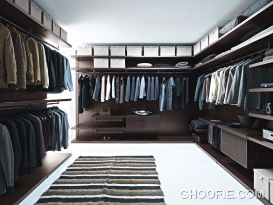 Walk in closet design for masculine man. The walk-in-closets are long with roomy spaces with plenty of different storage areas built from awesome furniture.