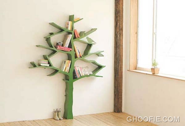Tree green wooden book shelf design. A fresh green tree is used in this shelf made with wood and acrylic paint.