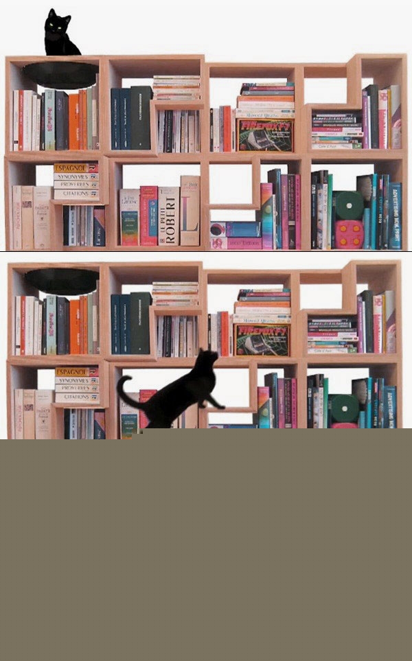Functional wooden bookcase cat friendly design ideas. This is a bookcase designed by Corentin Dombrecht. For those of you cat lovers, this bookcase is perfect for you because it has a ladder bookcase smooth as a kitten playing.