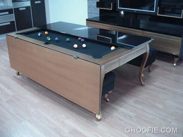 Modern dining table with pool design ideas. This is an interesting combination design. You can eat with an elegant table and after dinner you can directly play pool at the same table.