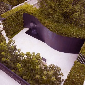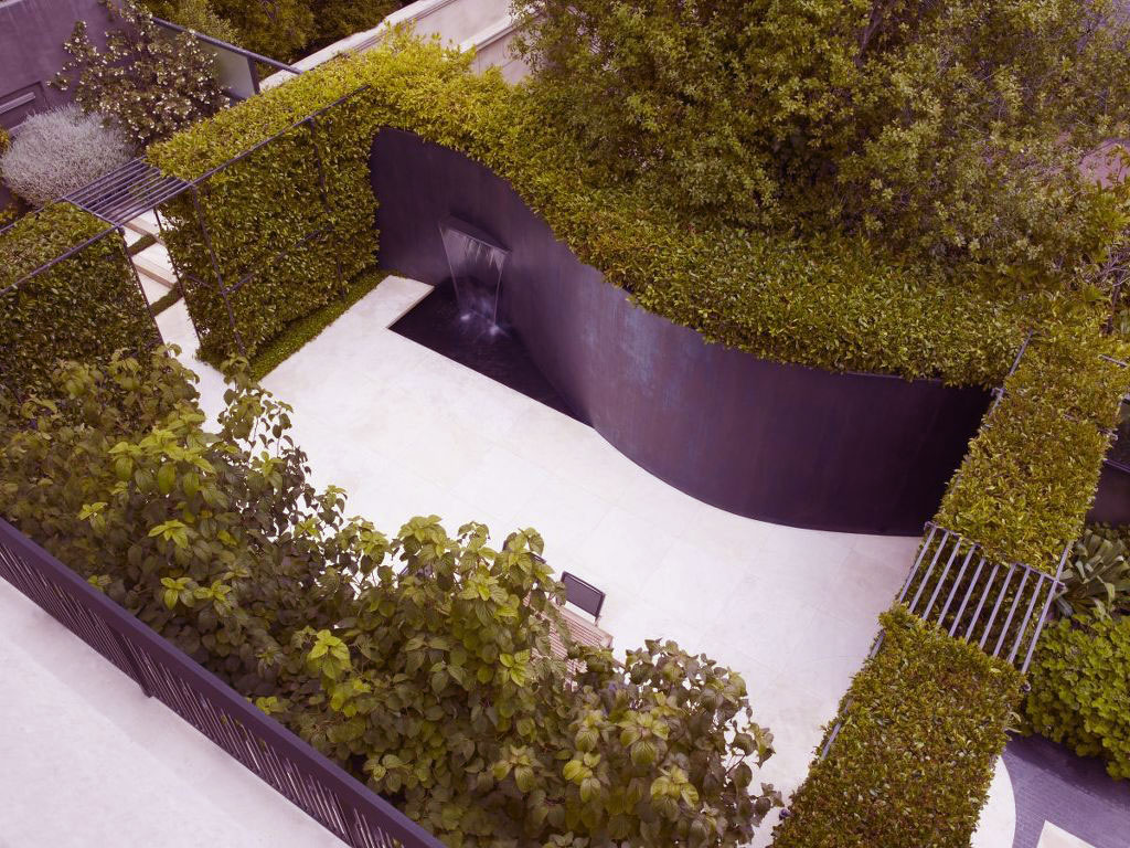 Water Feature Curved Garden Design Ideas. Modern backyard with bird view.
