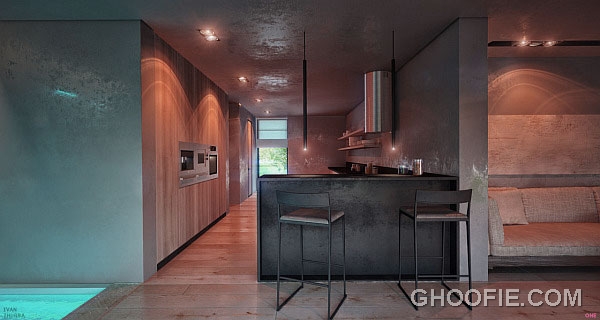 Comfy home spa design ideas with mini bar. Between the pool with a relaxing spot separated by a mini bar. The lighting in this room is a bit dim. There is a pretty comfortable couch.