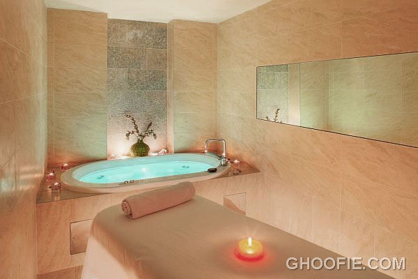 Fancy indoor spa design ideas with massage table. In this room there is a modern oval tub. After soaking you can directly massage on massage table provided.