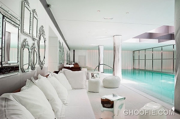 Lavish home spa design ideas with white sofa. The room decor is predominantly white. There are several mirrors with diverse shapes on the wall. Glass Insulation limit indoor pool.