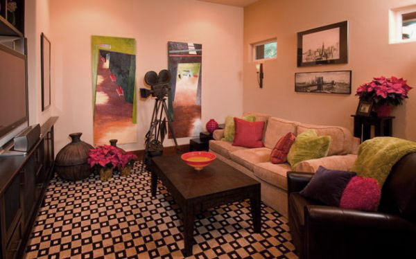 Classy movie room design with colorful pillow. Beautifully artistic paintings adorn the interior space of this room. There is also a vintage video camera is displayed in this room.