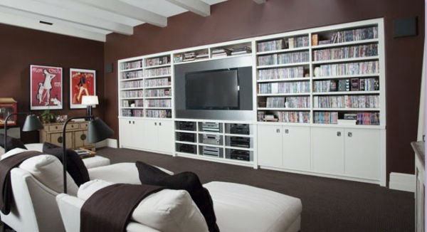 Minimalist movie room design with white movies collection storage. This room movies using a white sofa that comes with reading lights. Visible wooden beams in the ceiling design.