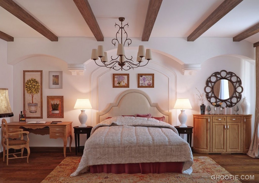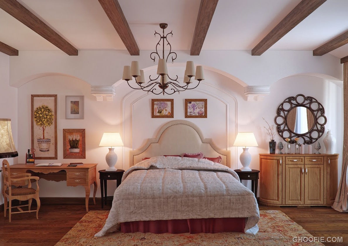 Classic Italian bedroom with oak and cream color by freelance architectural visualiser and illustrator, Svetlana Nezus.