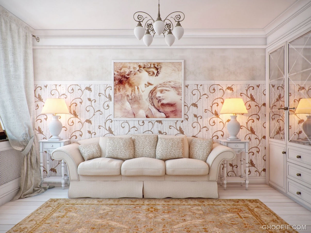 Cream living room with swirl floral wall decals by freelance architectural visualiser and illustrator, Svetlana Nezus.