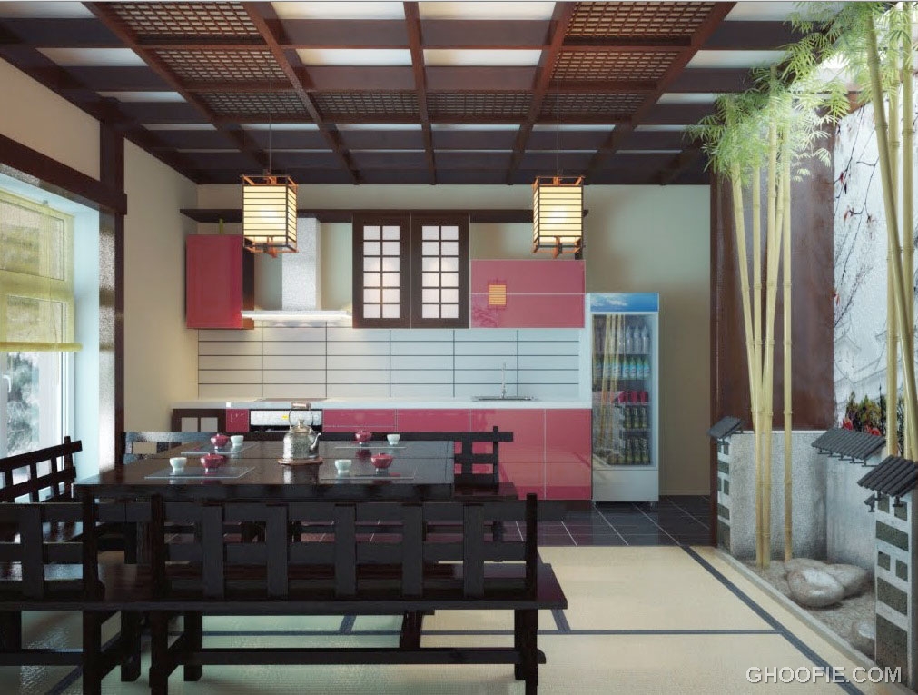 Japanese kitchen dining Space with bamboo decor by freelance architectural visualiser and illustrator, Svetlana Nezus.