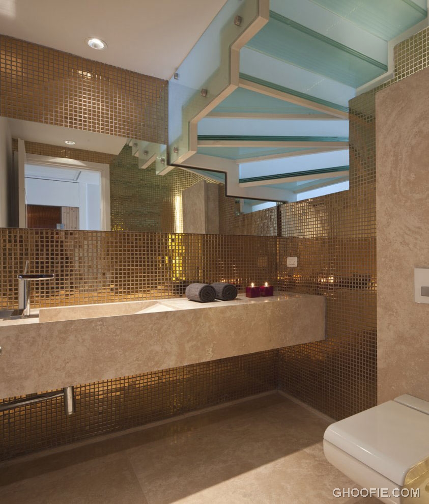Gold Bathroom Mosaic Tile Design. Luxury bathroom with sink and glass wall designed by Domb Architects.