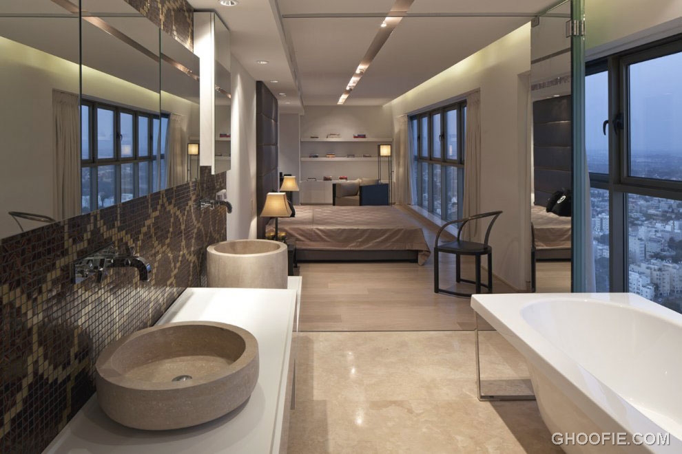 This Penthouse in Natanya, Israel has an amazing corner position with dramatic diagonal views of the Mediterranean Sea. The apartment is fitted with a marble floor, featuring romantic lighting and a gold mosaic tile bathroom. Living room is fitted with large windows and a glass wall, which allows a spectacular view of the sea. The bedroom suite and bathroom is in one area. This penthouse‘s primary focus is the beautiful Mediterranean sea view, so take a look at the gallery below... Read full article »
