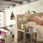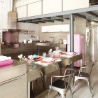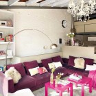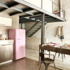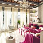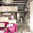 This beautiful and vintage apartment in Barcelona. The interior is done in sweet colors mostly, in pink, purple, white and red. The style used fresh furniture with vintage details. This house consists of two floor, on the first floor be found living room in one area with Stylish kitchen. 2nd room they have a master bedroom, from here the owner can see the living room.