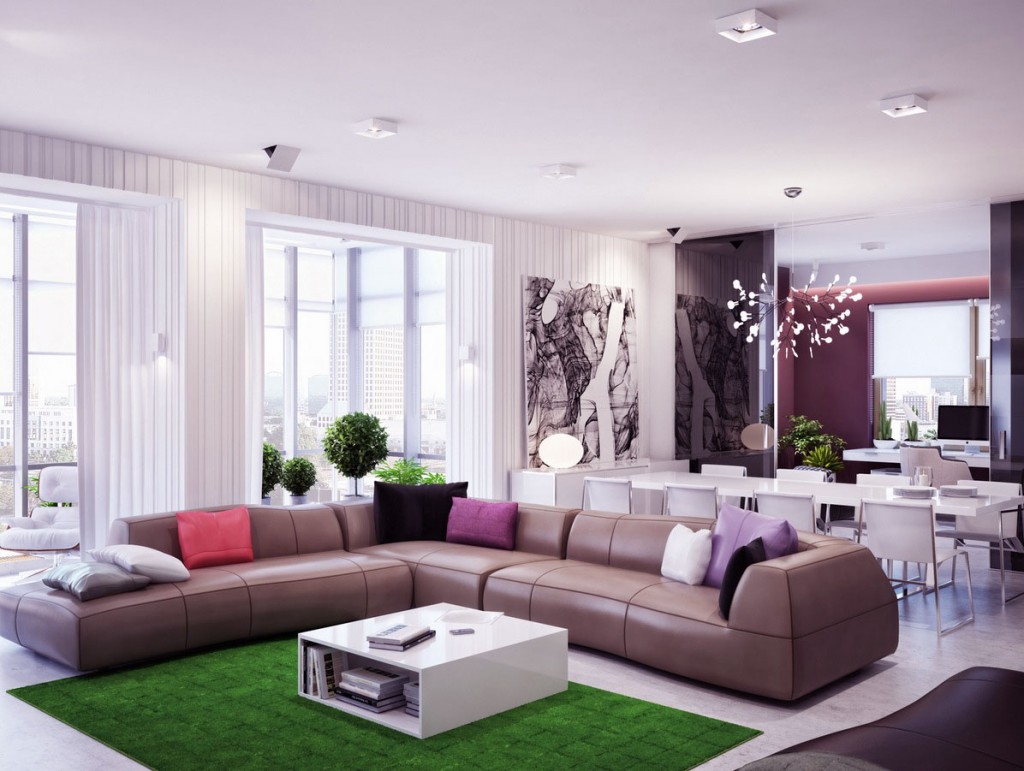 Visualizing a good apartment interior design is the first step toward making a beautiful home. This Ukrainian apartment interior was designed by Alexander Chervinskyi for Azovskiy and Pahomova Architects. The apartment contains a long dining room for seating eight people, and modern black & white kitchen with breakfast dining space within its monochrome palette. Modern lounge with cool grassy green rug by Alexander Chervinskyi for Azovskiy and Pahomova architects. Read full article »