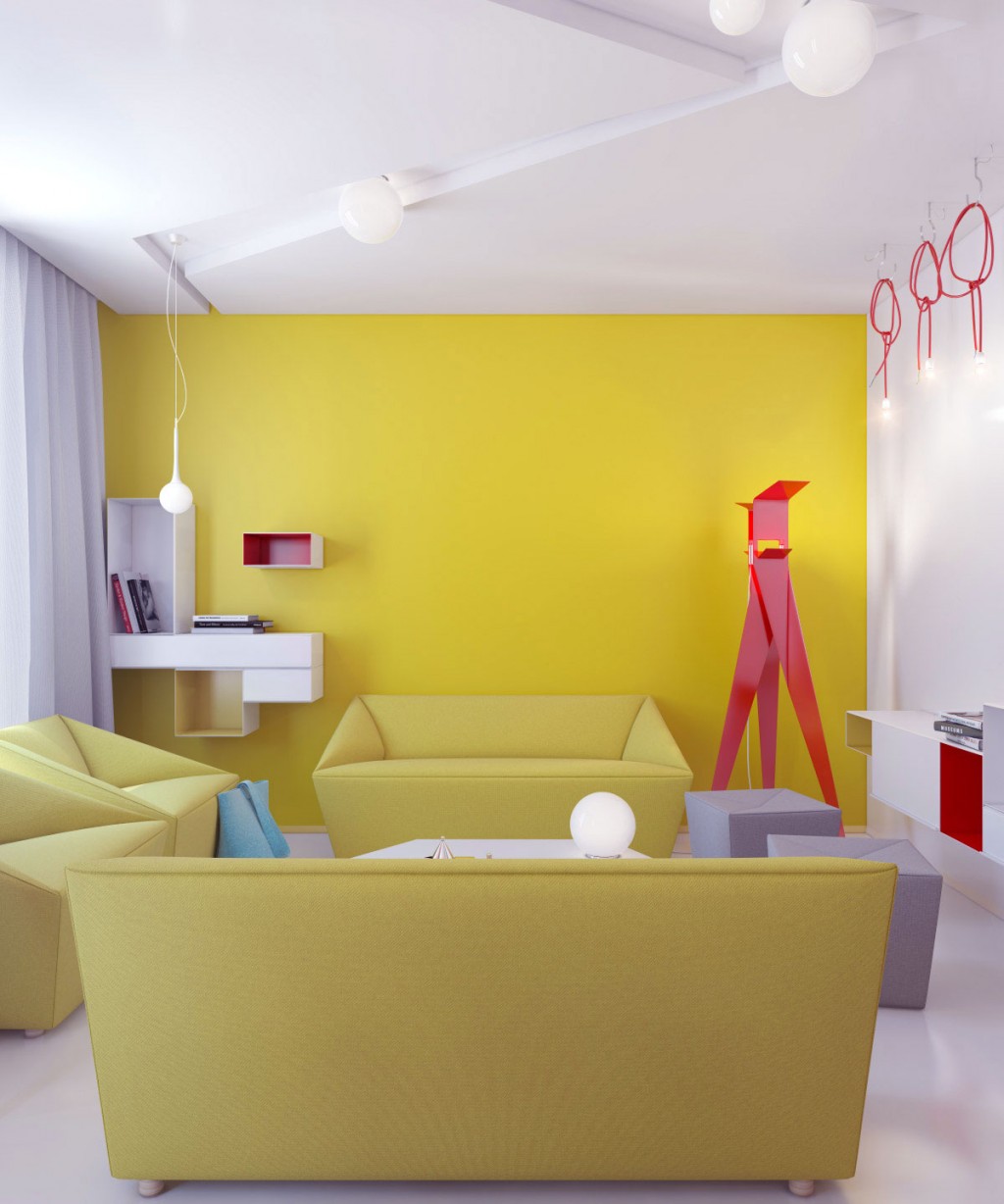Living room with yellow color and red accent by Ukrainian designer Anna Marinenko.