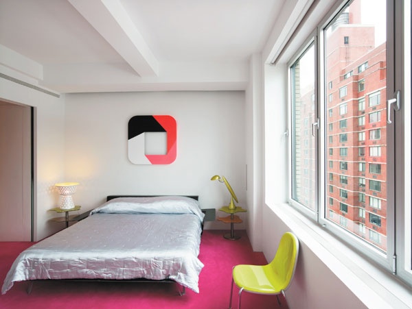 The large window gives natural light to this simple beautiful bedroom room making it look more bright. Master bedroom with pink floor and green chair by Karim Rashid.