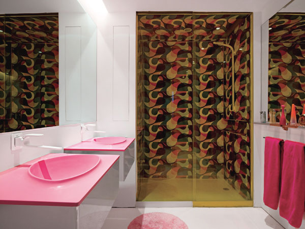 A simple yet beautiful bathroom with pink sink and wall pattern decor. Modern Pink Sink Bedroom Design by Karim Rashid.