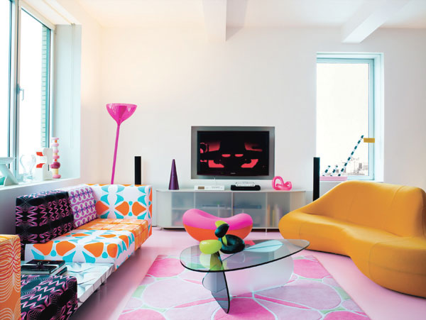 While playing your favorite game or watching your favorite TV program, you will feel more happy and fun because you’re surrounded bright color. Modern Pop Style Interior Living Room by Karim Rashid.