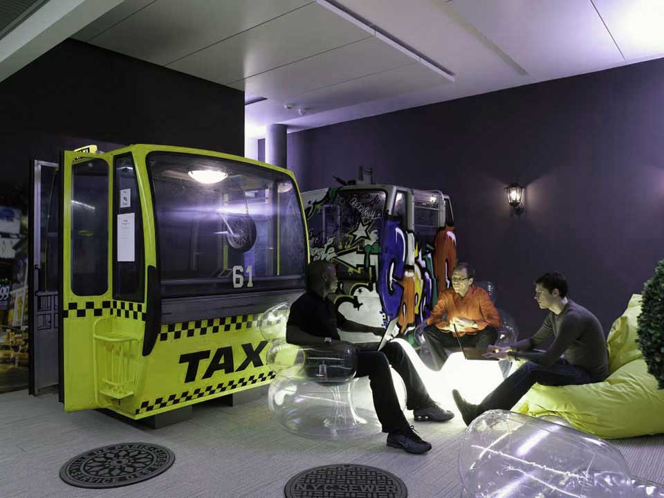 Google’s Zurich (Zooglers) building is one of their most known offices in the world. The Zurich offices are located in Switzerland. These offices are complete with meeting room, play room, fork restaurant, music studio, mini basketball court, serenity eggs, thinking gondolas etc. Scroll down to view more Zooglers pictures. Unique informal meeting room with yellow taxi decor. Creative meeting room with transparent air chair. Read full article »