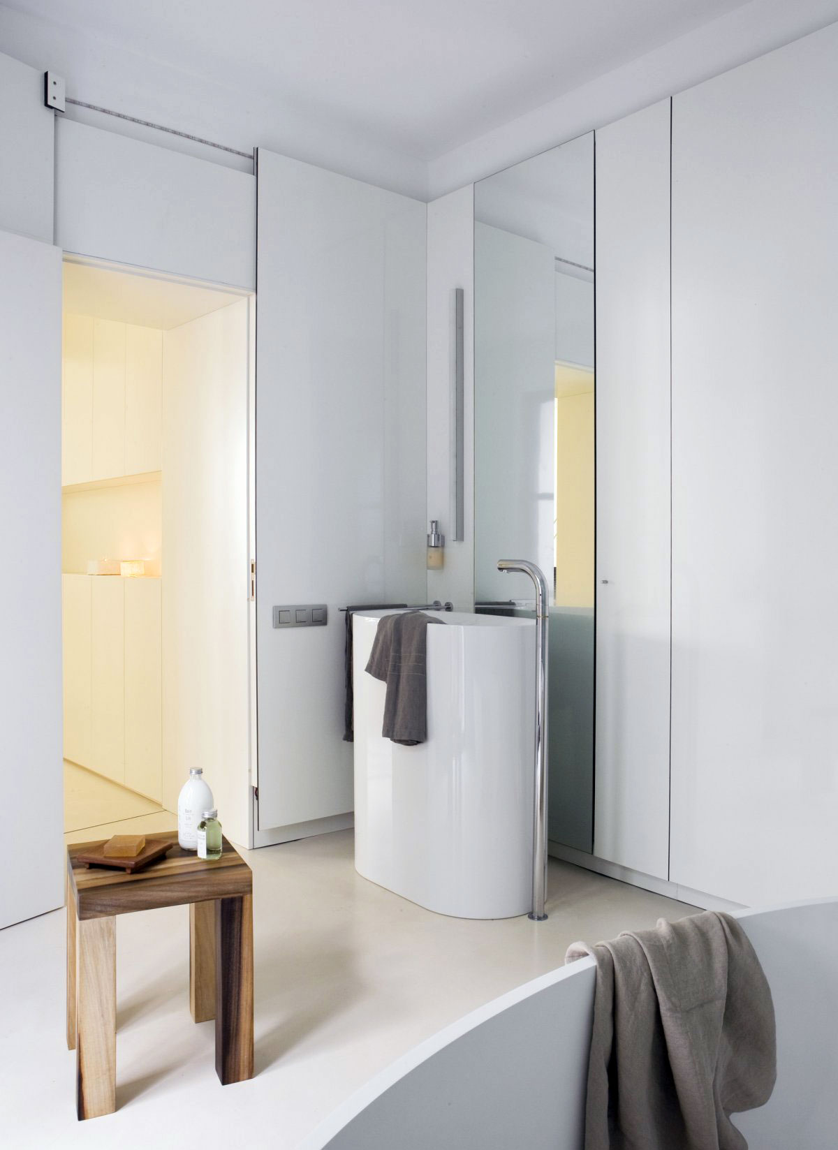 Amazing White Small Bedroom Apartment Design. High Mirror in the small bathroom apartment.